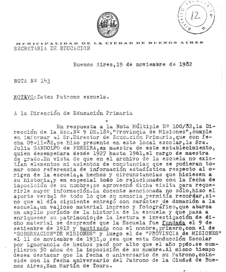 - El 22 de octubre, además, comienza a desarrollar sus actividades la Escuela de Adultos N° 12, del DE 17°.