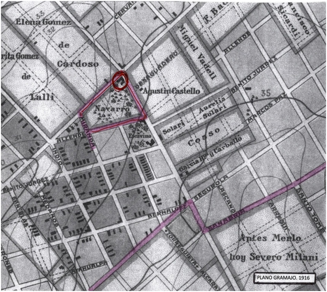 He resaltado el dibujo del edificio que ocupa la escuela en la finca que el plano Municipal de 1916 había señalado como perteneciente a “Navarro” [1]. Como se observa es la única construcción que se encuentra en las dos manzanas que ostentan una señalética de zona arbolada.